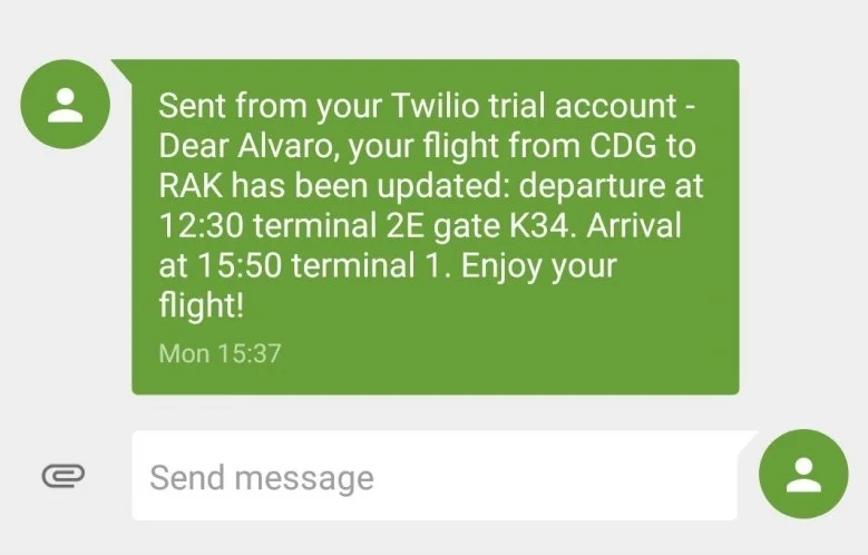 The Notifier service receives flight status updates from the Monitor and uses the Twilio SMS API to notify the end. The service has a very simple implementation: when the Notifier receives a flightStatus message, it uses the message payload to build an SMS message: